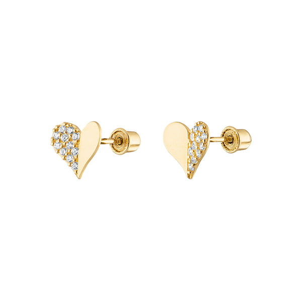 Half Pave Heart Stud Earrings 14K Gold